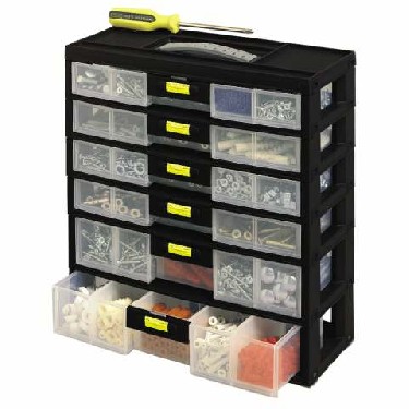 Compartimentos modulables. Cajones transparentes con cierre de seguridad y base antideslizante.